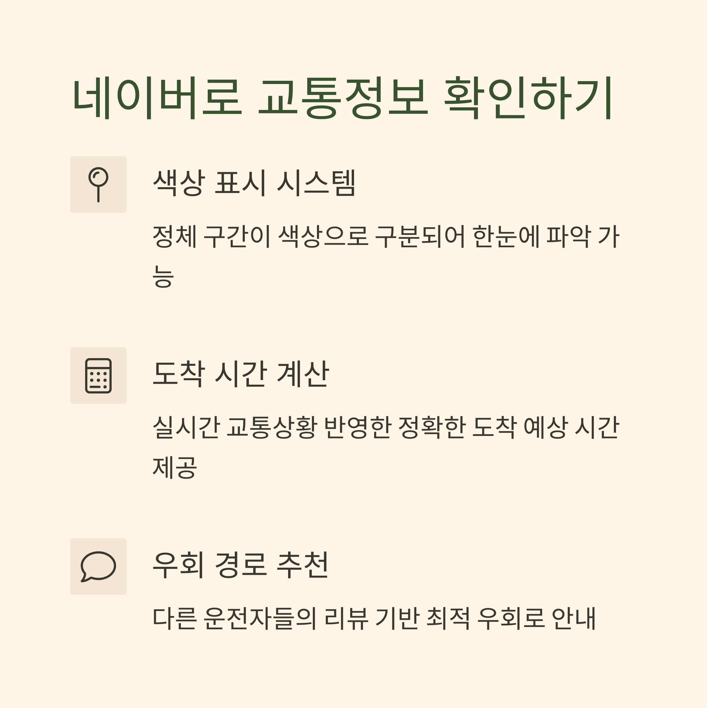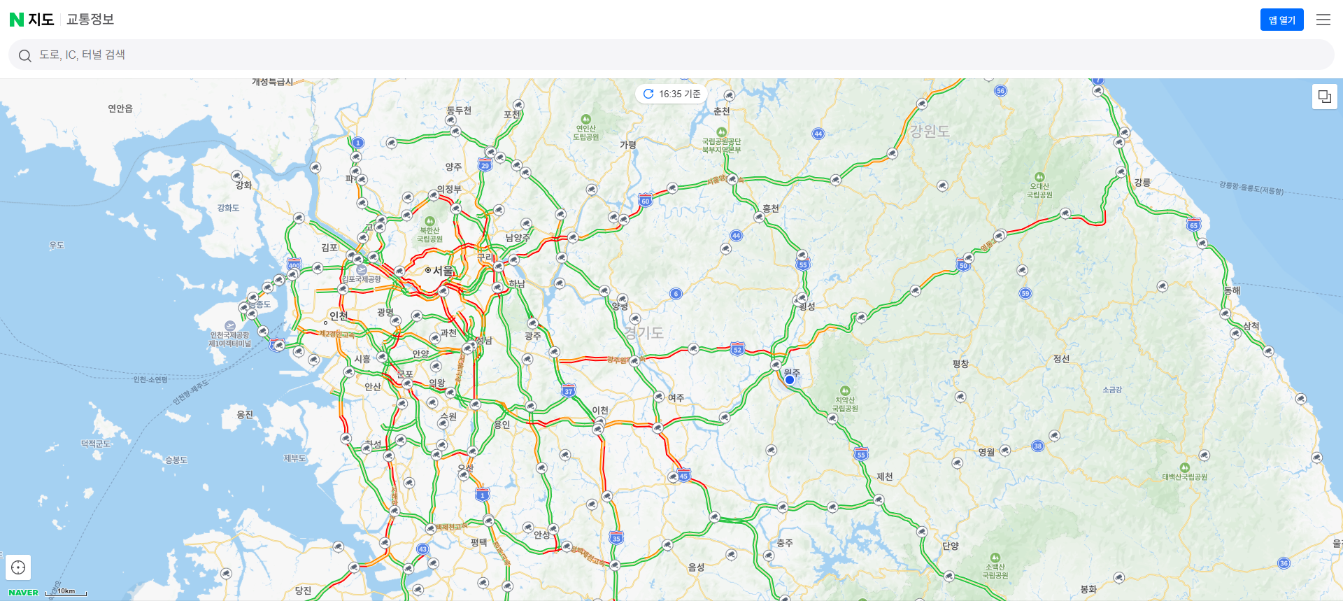 - 네이버 지도 앱에서 '교통정보' 탭을 클릭하면, 실시간 정체 구간이 색상으로 표시됩니다.