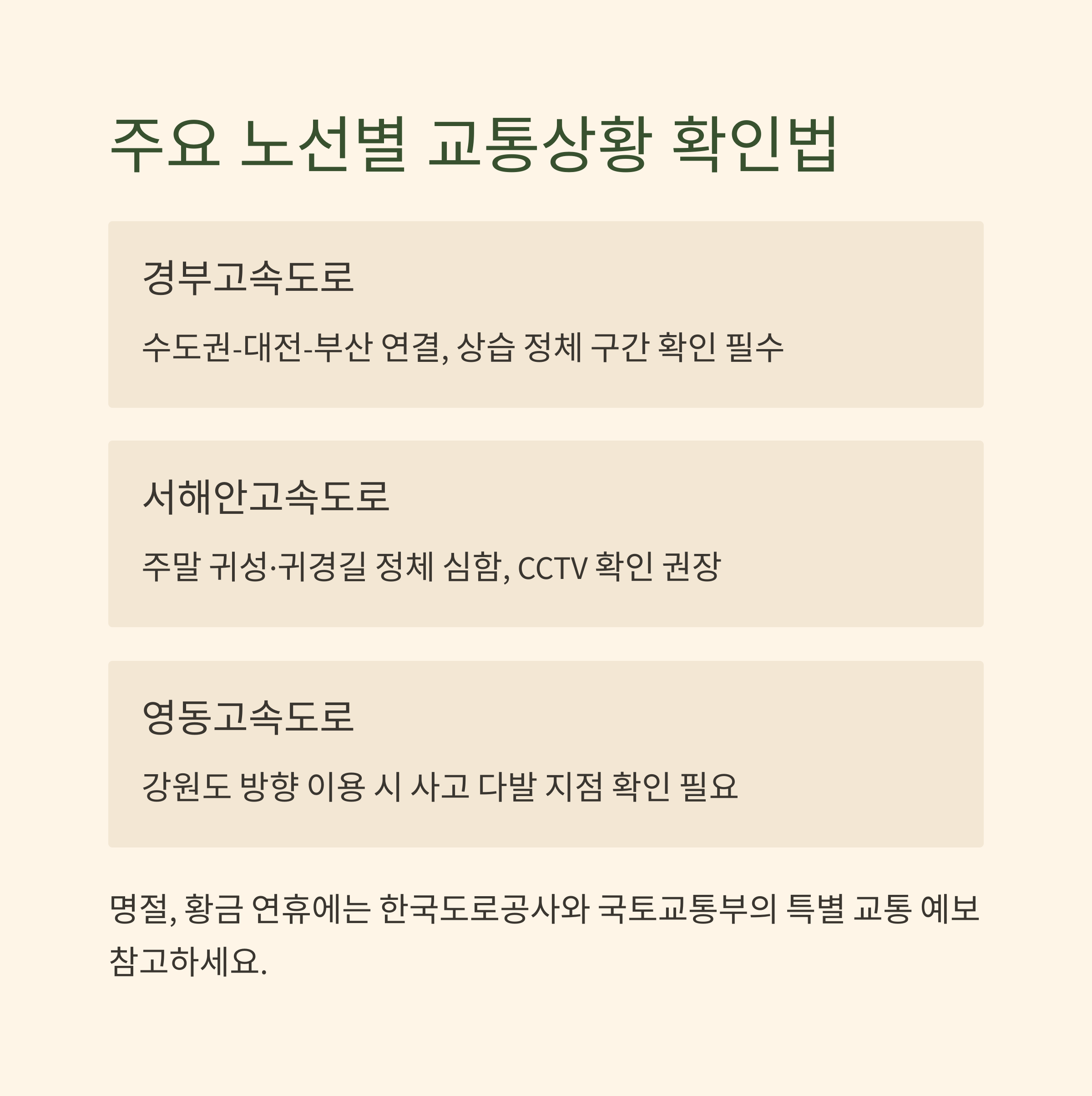 - 경부고속도로 : 수도권-대전-부산을 잇는 핵심 노선, 상습 정체 구간 확인 필수