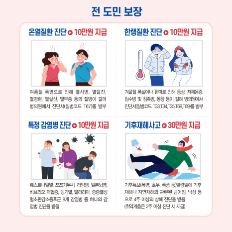 폭염, 한파, 감염병에 입원해도 ‘경기도 기후보험’이 전액 보장합니다. 경기 기후보험은 경기도민이라면 무료로 자동가입되며, 기후 피해 발생 시 보험금 신청이 가능합니다.