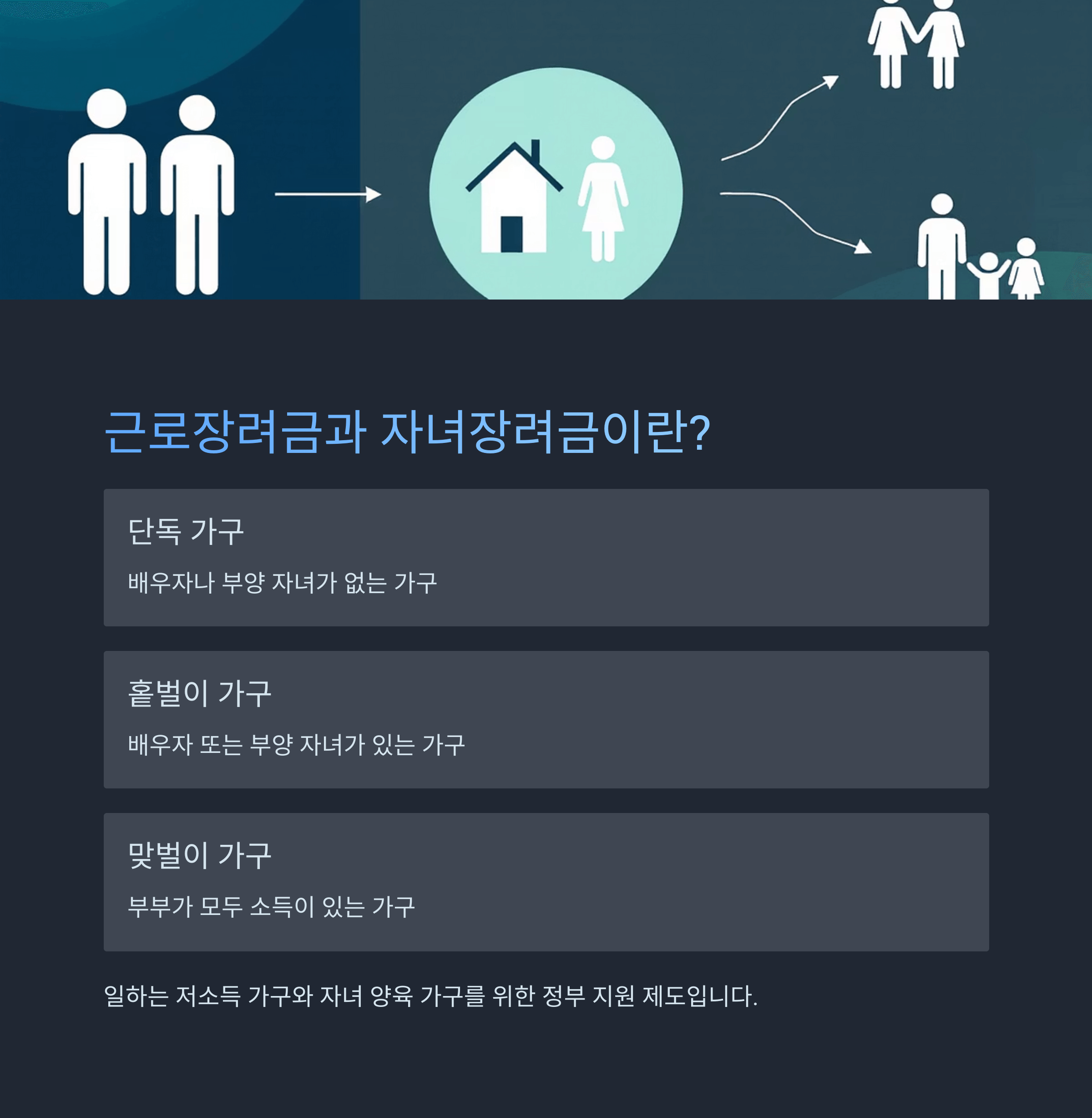 근로장려금은 정부가 일하는 저소득 가구에게 지급하는 장려금으로, 성실하게 일하고 있지만 수입이 적어 어려움을 겪는 가구의 생활을 돕기 위한 제도입니다. 자녀장려금은 자녀 양육 가구에게 추가적으로 지급되는 금액입니다.
