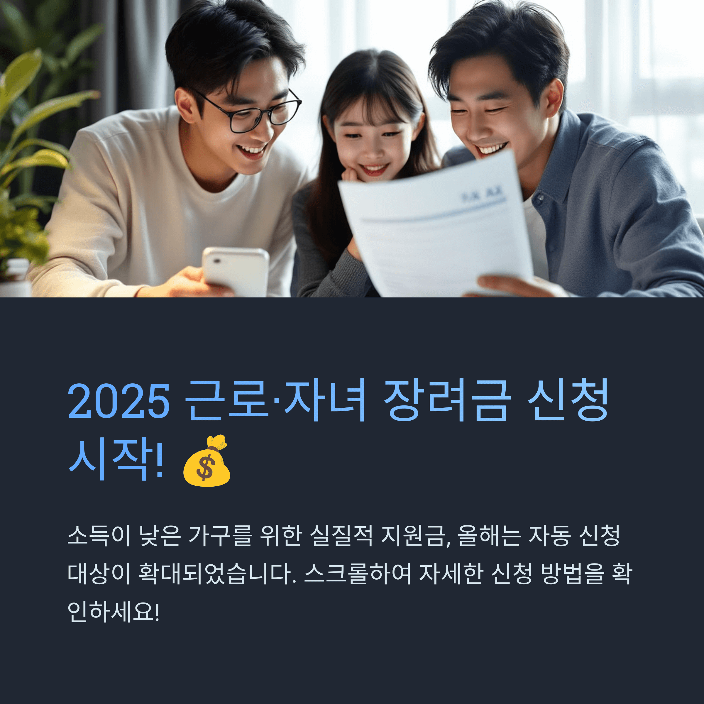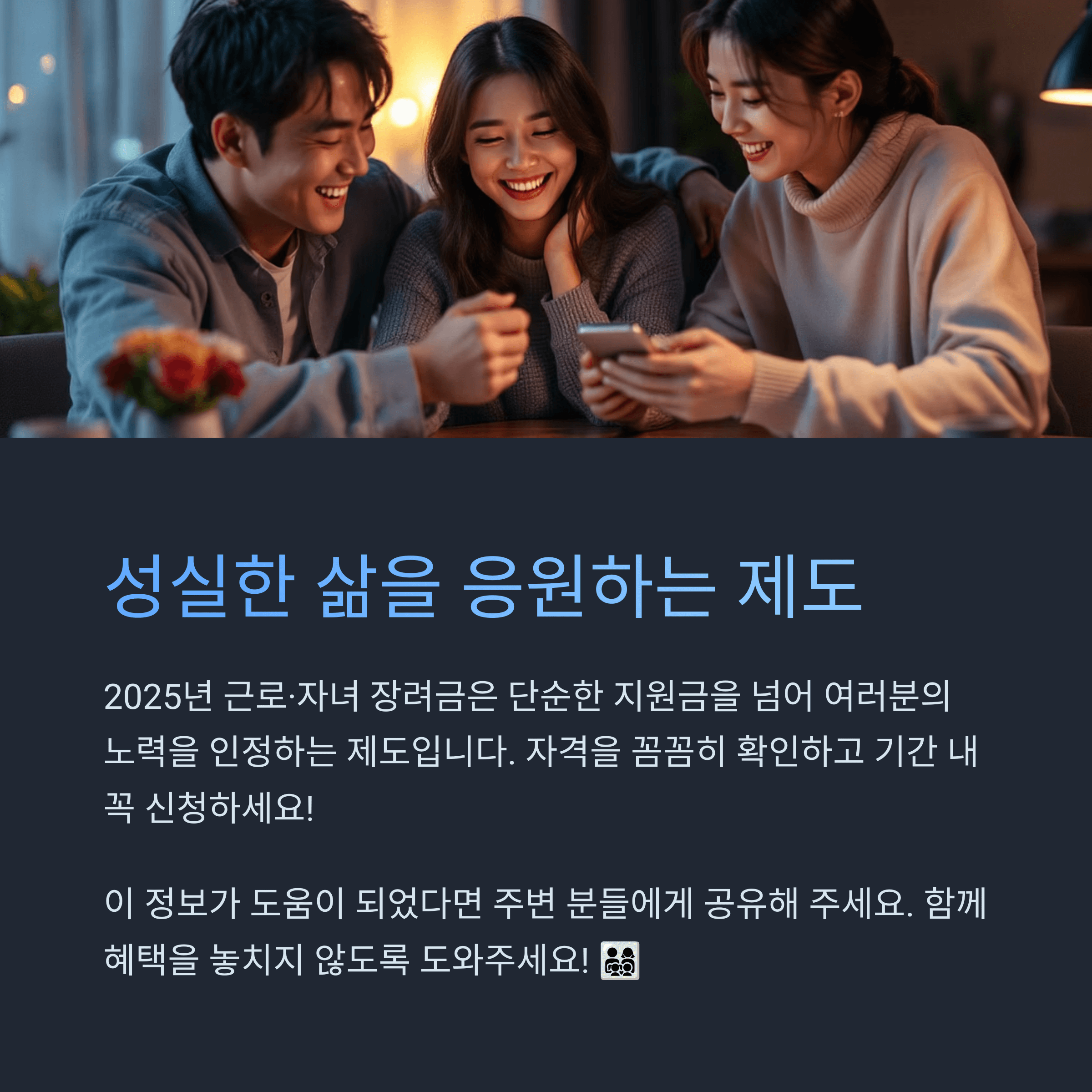 2025년 근로·자녀 장려금은 단순한 지원금을 넘어서, 여러분의 성실한 삶을 응원하는 제도입니다. 꼼꼼한 자격 확인 후 꼭 기간 내 신청하세요!
