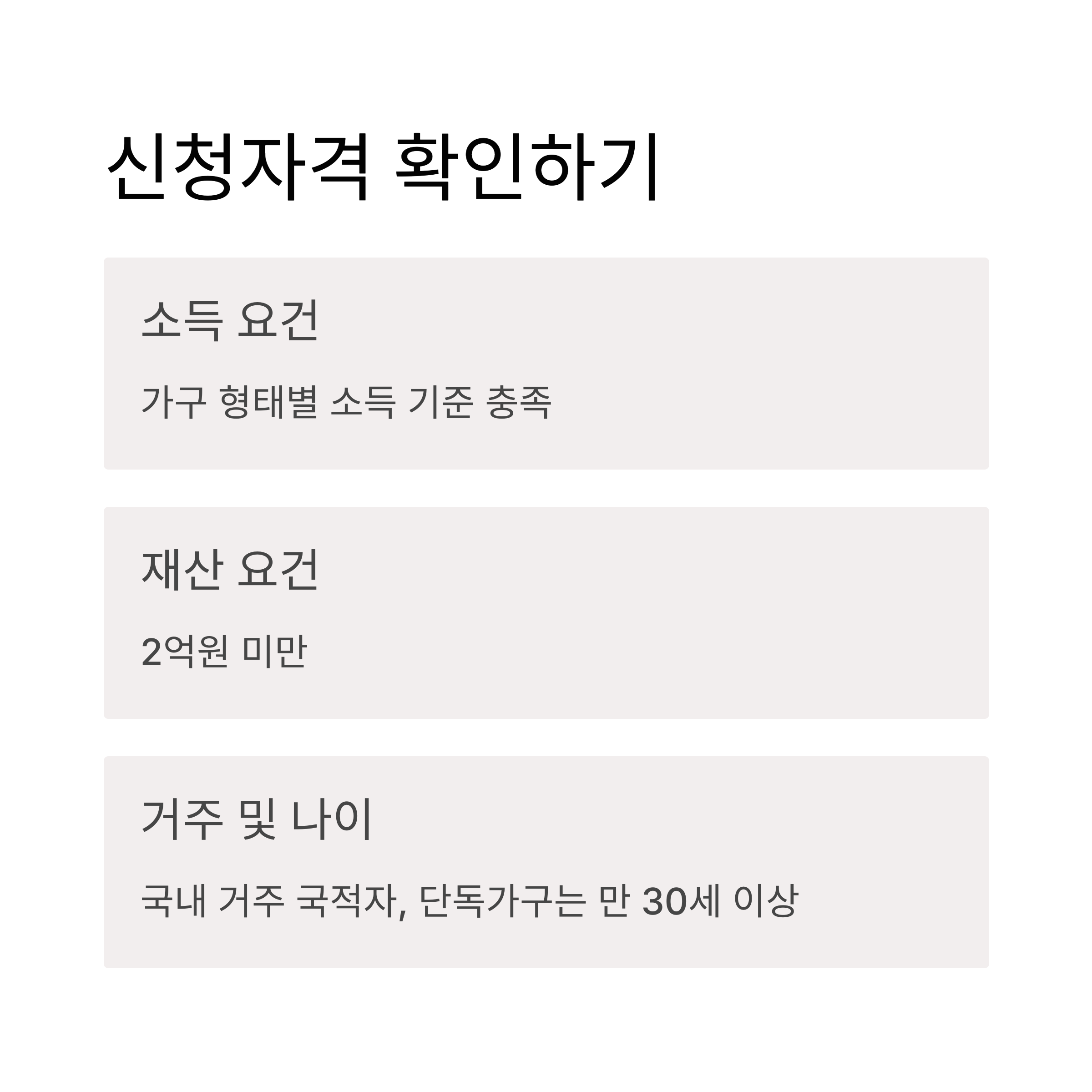 - 나이 요건: 단독가구는 만 30세 이상 또는 부양가족 있어야 신청 가능