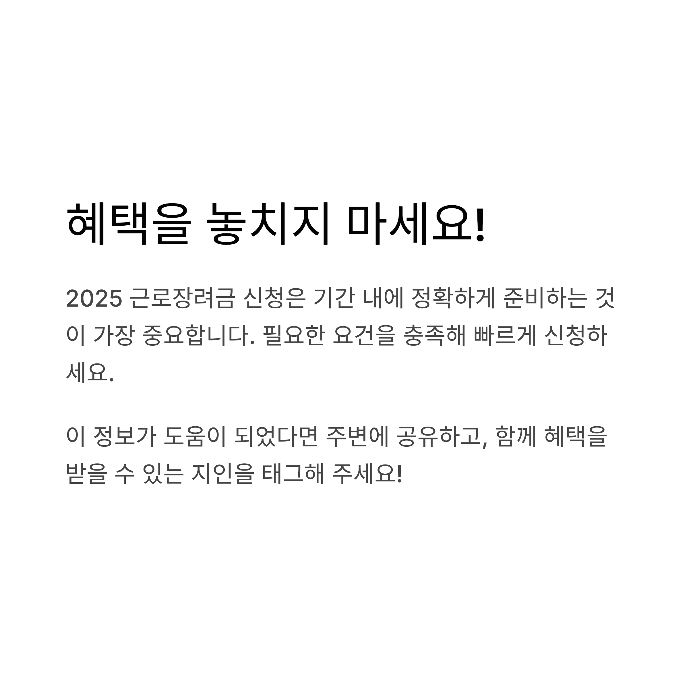 2025 근로장려금 신청은 기간 내에 정확하게 준비하는 것이 가장 중요합니다. 기간을 놓치지 말고 필요한 요건을 충족해 빠르게 신청하여 지원 혜택을 놓치지 마세요!