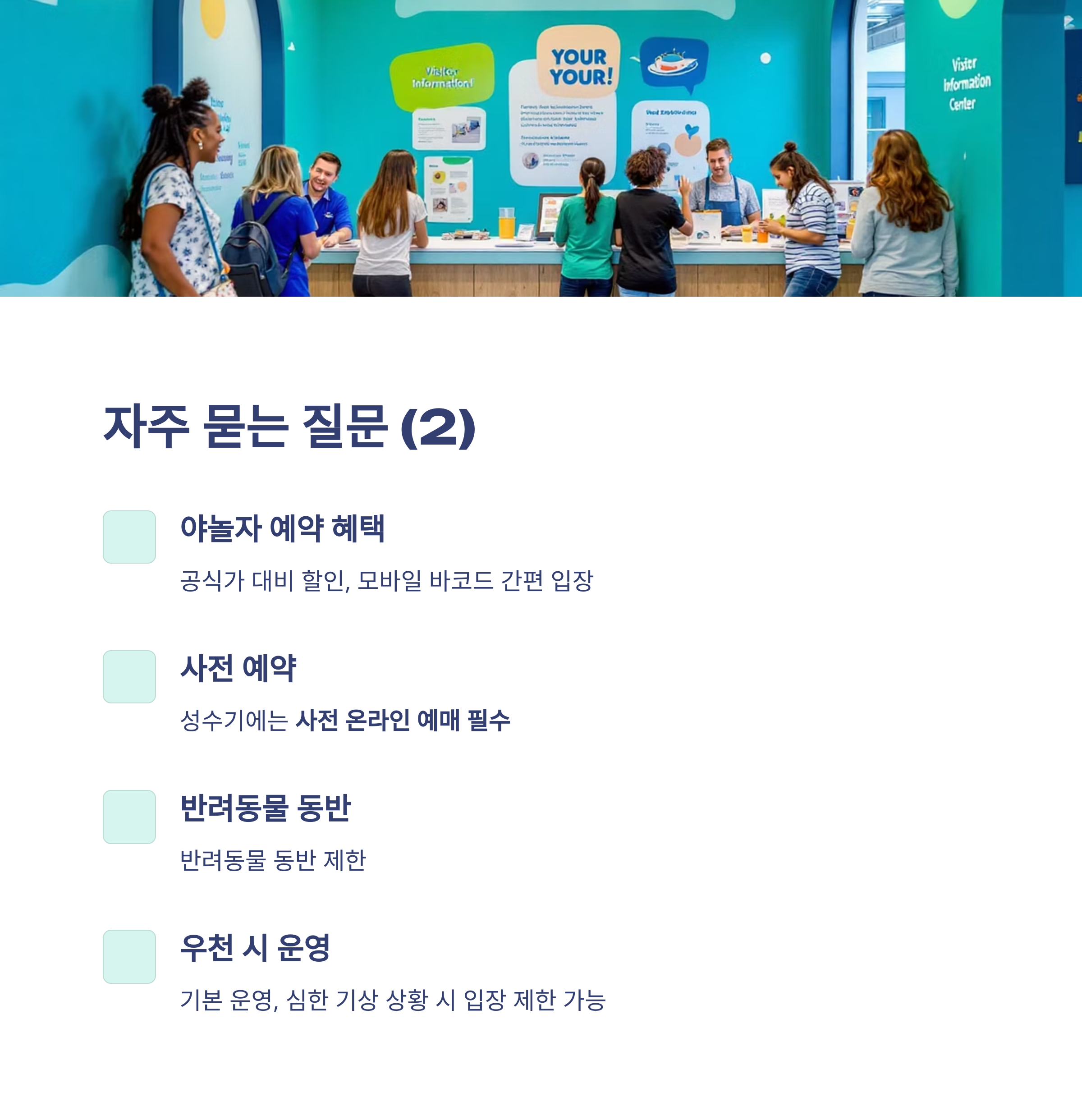 A3. 기본적으로 우천 시 운영되나, 기상이 심할 경우 입장이 제한될 수 있습니다.