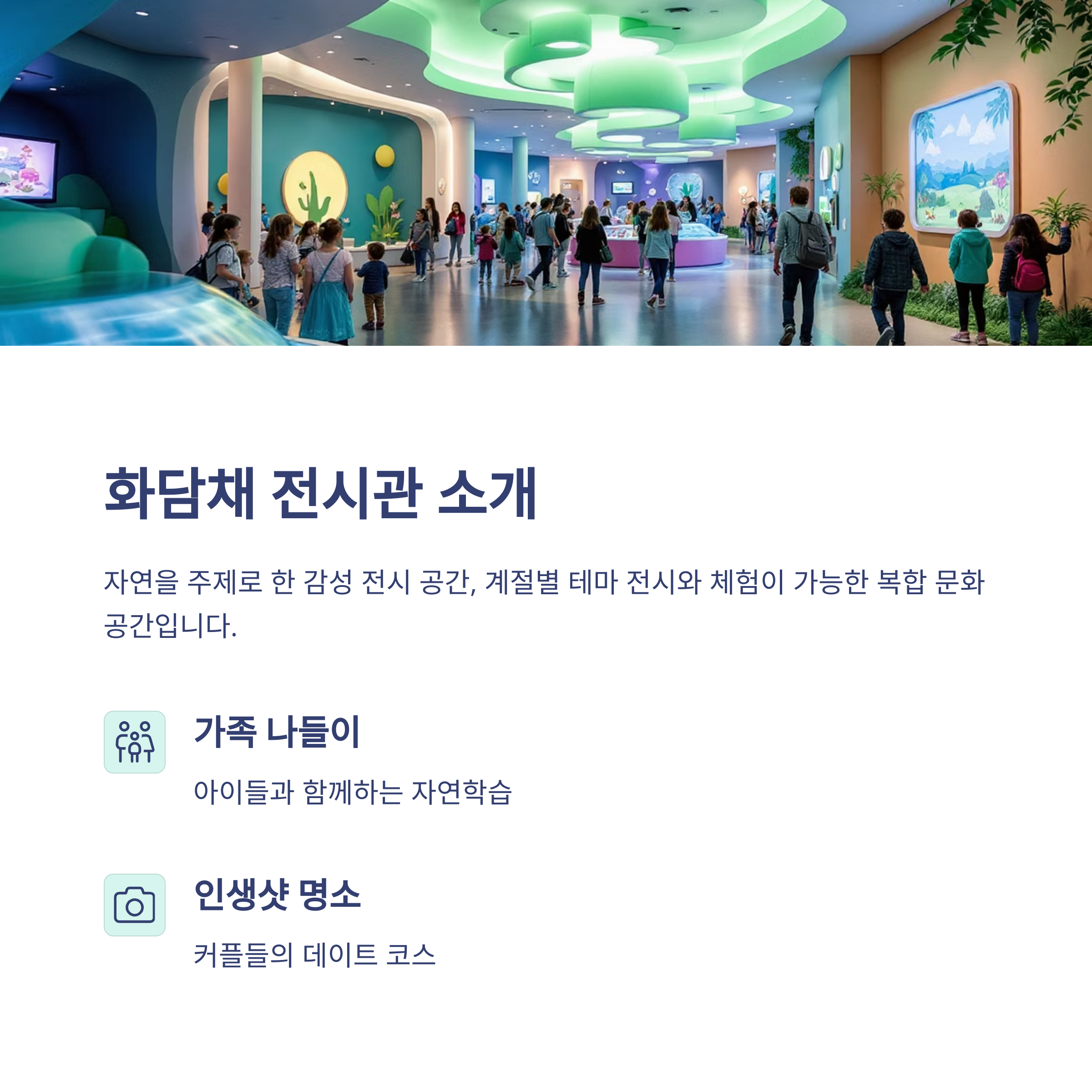 화담채는 자연을 주제로 한 감성 전시 공간으로, 계절별 테마 전시와 체험이 가능한 복합 문화공간입니다.