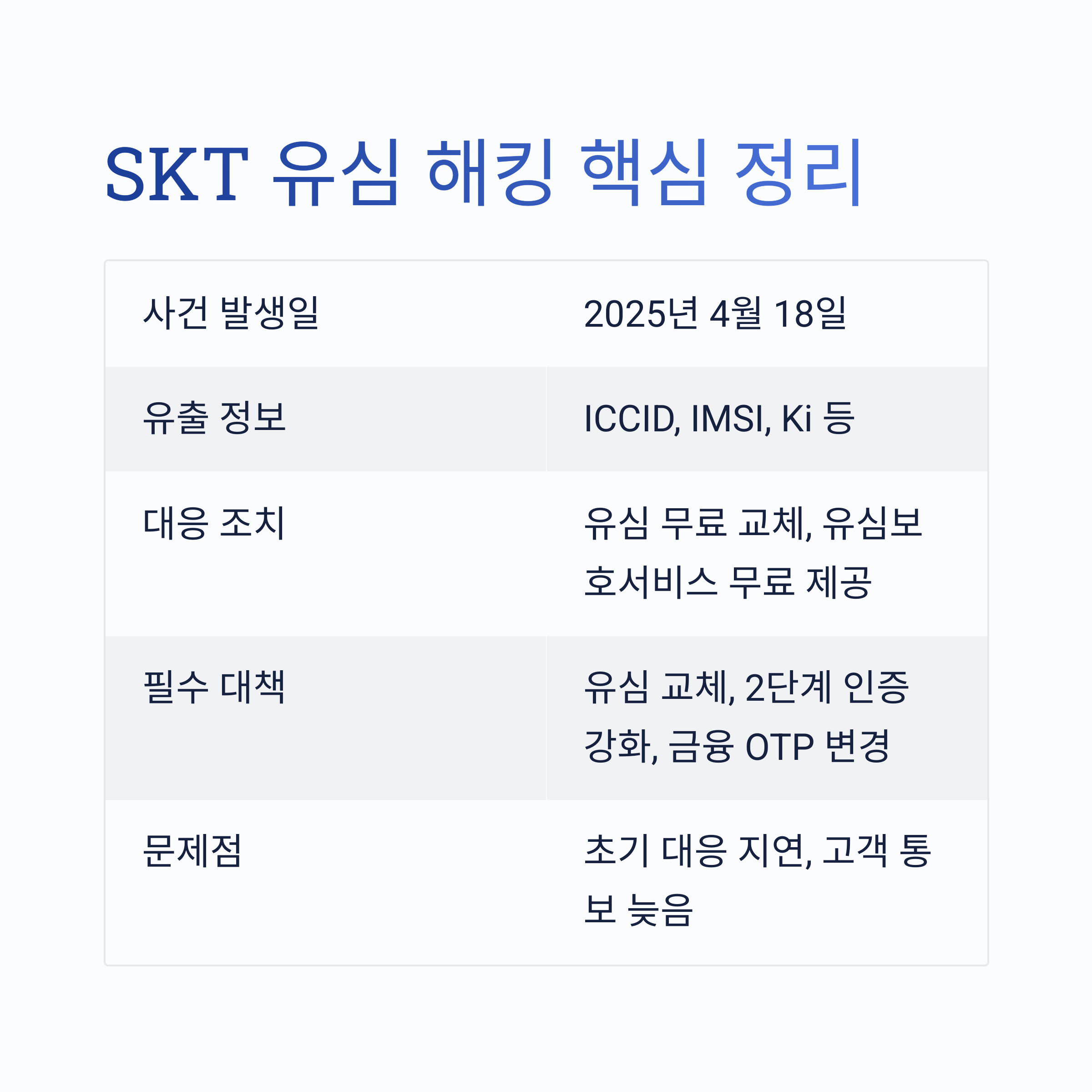 | 필수 대책 | 유심 교체, 2단계 인증 강화, 금융 OTP 변경 |