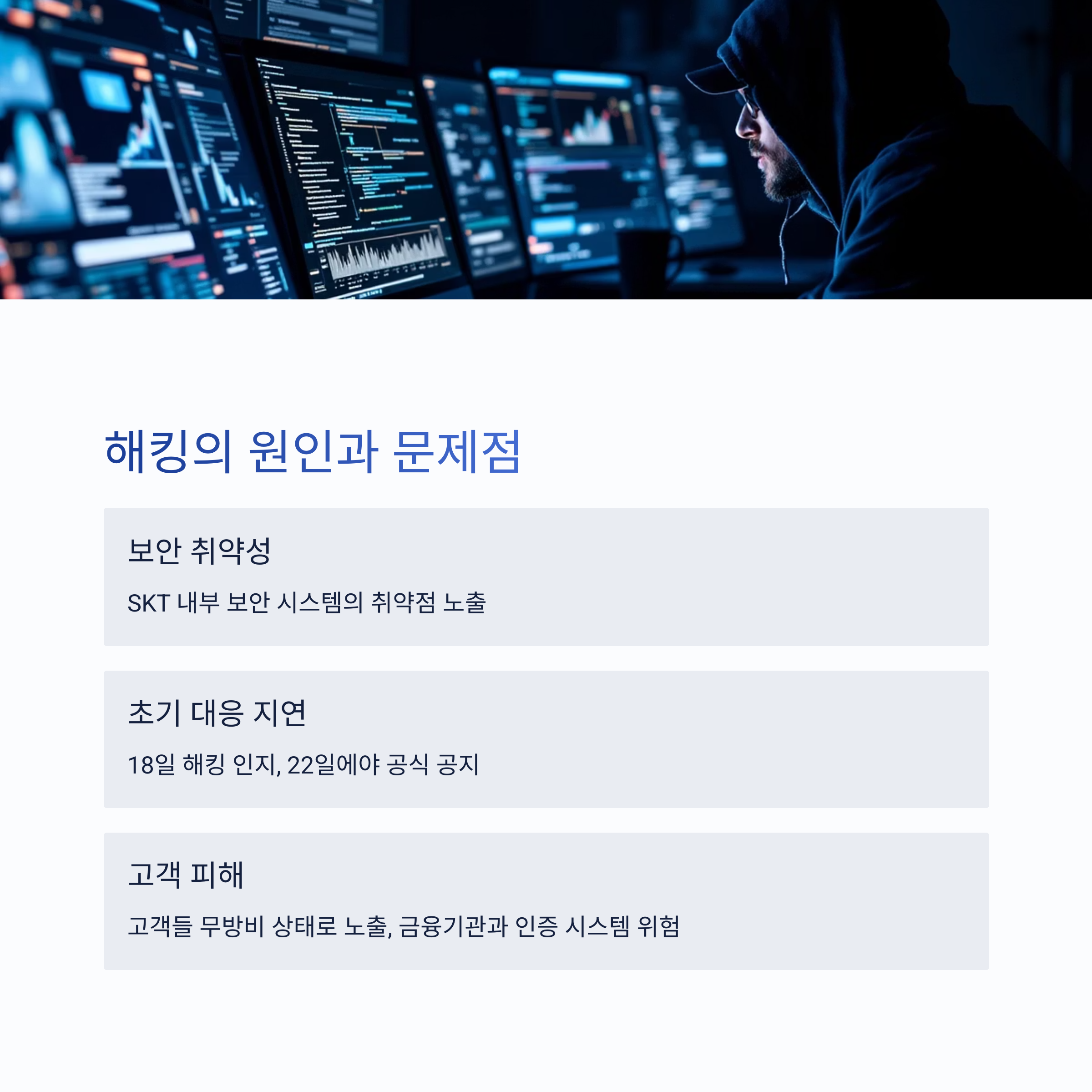 이번 해킹은 SKT 내부 보안 시스템의 취약성과 초기 대응 지연이 원인이었습니다.