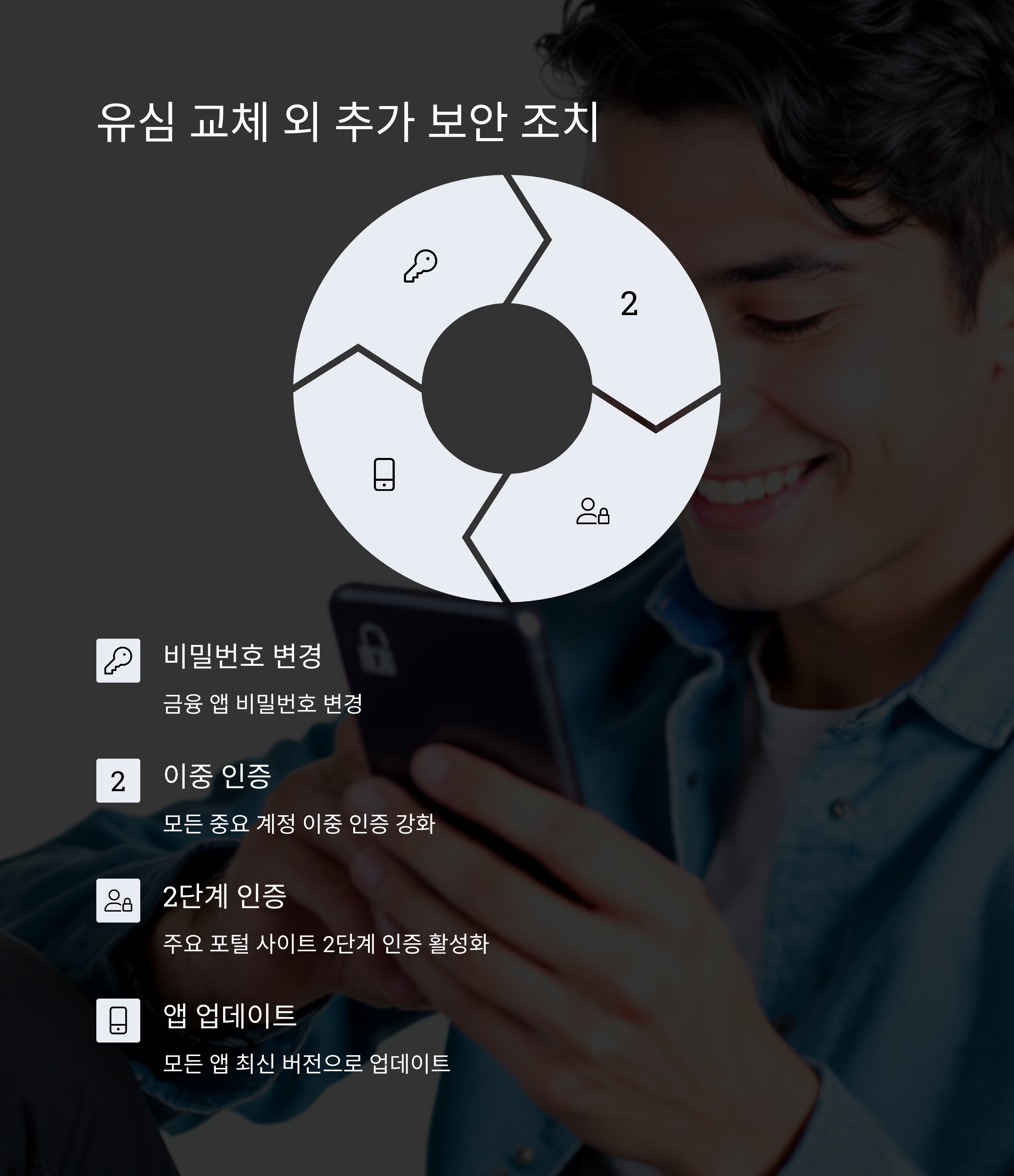 A. 금융 앱 비밀번호 변경, 이중 인증 강화, 주요 포털 사이트 2단계 인증 활성화 등이 필요합니다.