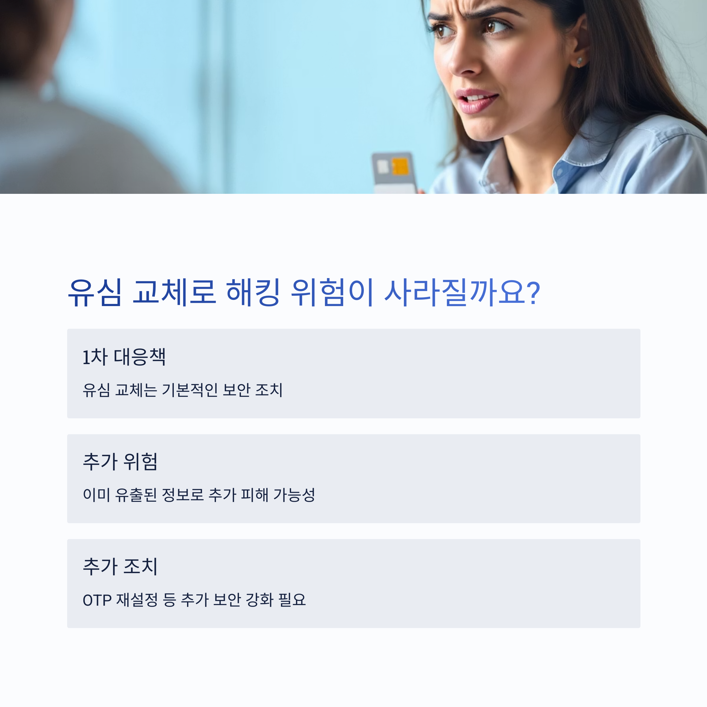 A. 유심 교체는 1차적 대응책입니다. 그러나 이미 유출된 정보로 추가 피해가 발생할 수 있어 OTP 재설정 등 추가 조치가 필요합니다.