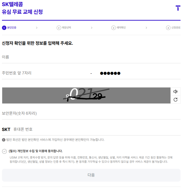 1) SKT 유심 교체 예약 페이지에 접속합니다.